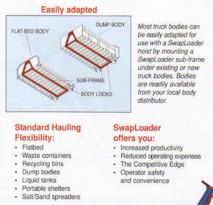 | SL-240 "Swap" bodies within minutes. The SL-240 SwapLoader hook-lift hoist is the perfect choice for the construction, waste, municipal, and material handling markets, to name just a few. Get more out of just one truck with a SwapLoader hook-lift hoist. The SL-240 is designed for a short wheelbase chassis, giving you tremendous maneuverability and strength in a very tough, economical package. A SwapLoader hook-lift lets you "swap" bodies in a matter of minutes, all from inside the safety and comfort of the cab. This allows you to use one truck as a flatbed, dump body, van body, water tank, spray tank, etc. SwapLoader hook-lift hoists are covered with an exclusive 3-year warranty. Call 1-866-433-2075 or contact sales@martintruckent.com for more information. |