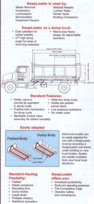 | Increase productivity and profitability: One truck equipped with the SwapLoader hook-lift hoist reduces the need for a large fleet of trucks. SwapLoader hook-lift hoists can carry many different bodies and perform many different jobs |