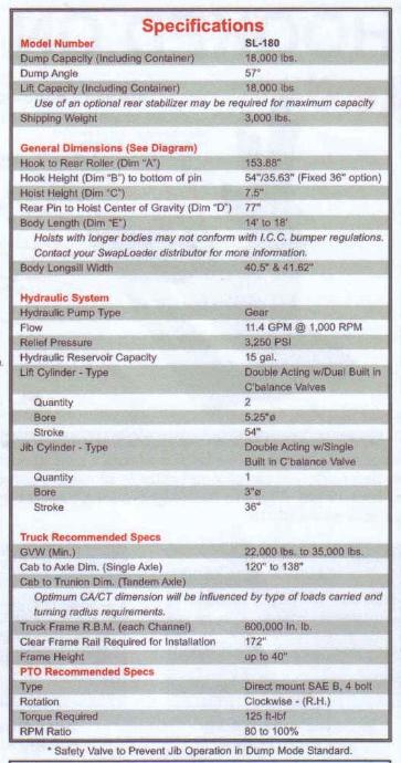 | More for your money.... The SL-180 retains the great benefits built in to all SwapLoader models. This is the ideal unit for light to medium-duty chassis. Contractors, landscapers, material haulers, and many more industries will benefit from the power and maneuverability in this unit. |