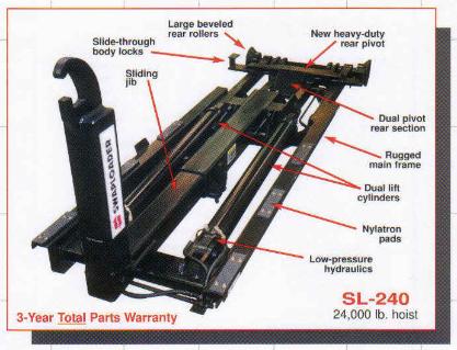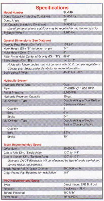 | SL-240 "Swap" bodies within minutes. The SL-240 SwapLoader hook-lift hoist is the perfect choice for the construction, waste, municipal, and material handling markets, to name just a few. Get more out of just one truck with a SwapLoader hook-lift hoist. The SL-240 is designed for a short wheelbase chassis, giving you tremendous maneuverability and strength in a very tough, economical package. A SwapLoader hook-lift lets you "swap" bodies in a matter of minutes, all from inside the safety and comfort of the cab. This allows you to use one truck as a flatbed, dump body, van body, water tank, spray tank, etc. SwapLoader hook-lift hoists are covered with an exclusive 3-year warranty. Call 1-866-433-2075 or contact sales@martintruckent.com for more information. |