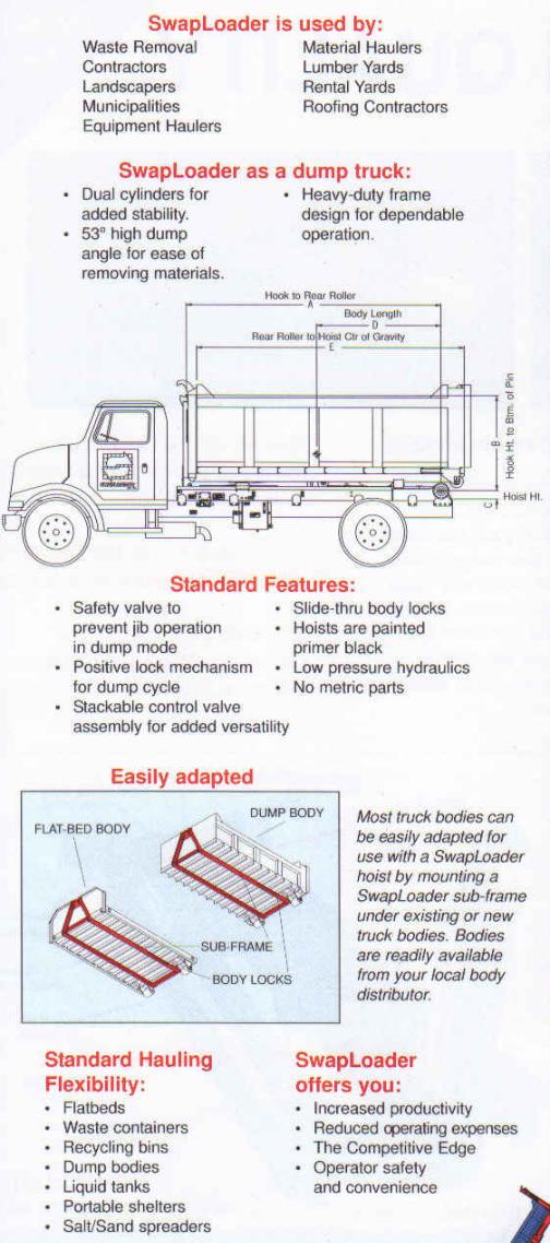 | Swap truck bodies quickly and easily: The SwapLoader hook-lift hoist lets you mount and dismount truck bodies (flat beds, dump bodies, vans, sand/salt spreaders, water tanks, waste and recycling containers, and more) without leaving the cab of your truck. |