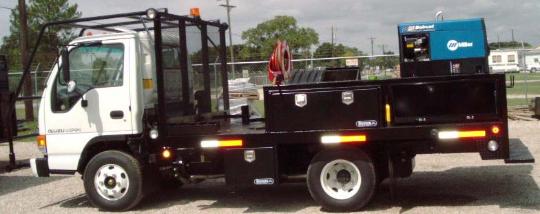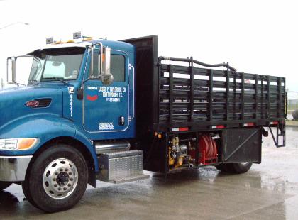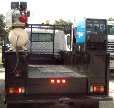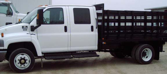 | To show the versatility and variety of beds we build, here is another stake side bed but with a pump and hose reel system on the bottom. This one was custom designed for a local oil company. |