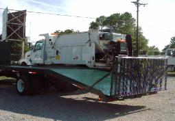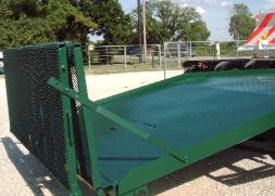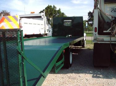 | Pictured here is a custom 33' Dovetail Flatbed with a specially designed, hydraulic powered, folding ramp/tailgate. This bed was built to haul golf cars. |